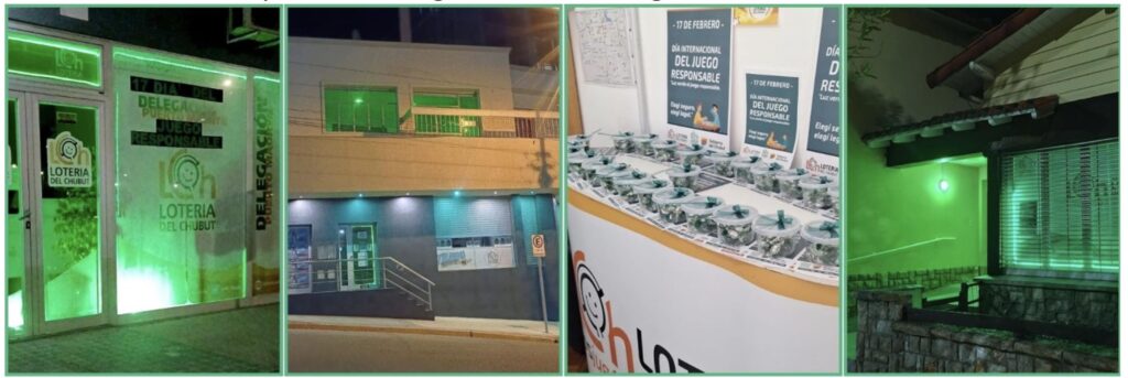 Como actividad institucional, tanto Casa Central como las delegaciones de Trelew, Puerto Madryn, Esquel y Comodoro Rivadavia decidieron sumarse a la conmemoración iluminando de color verde sus edificios, bajo el lema “Luz verde al juego responsable, elegí seguro, elegí legal”.